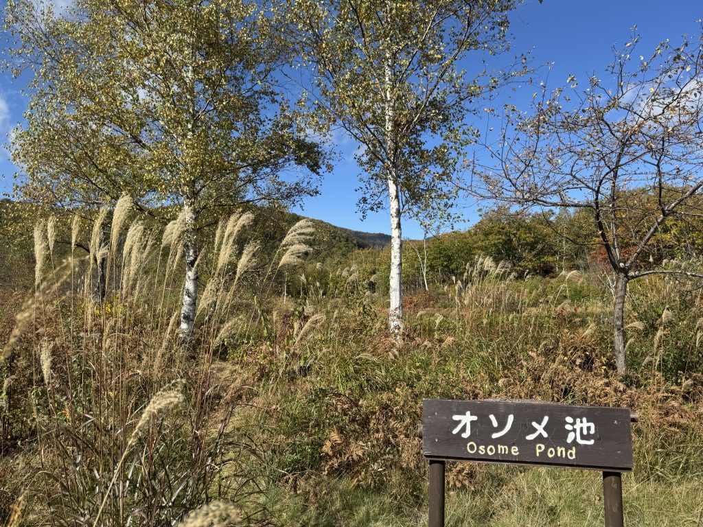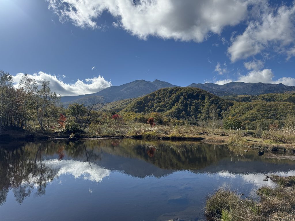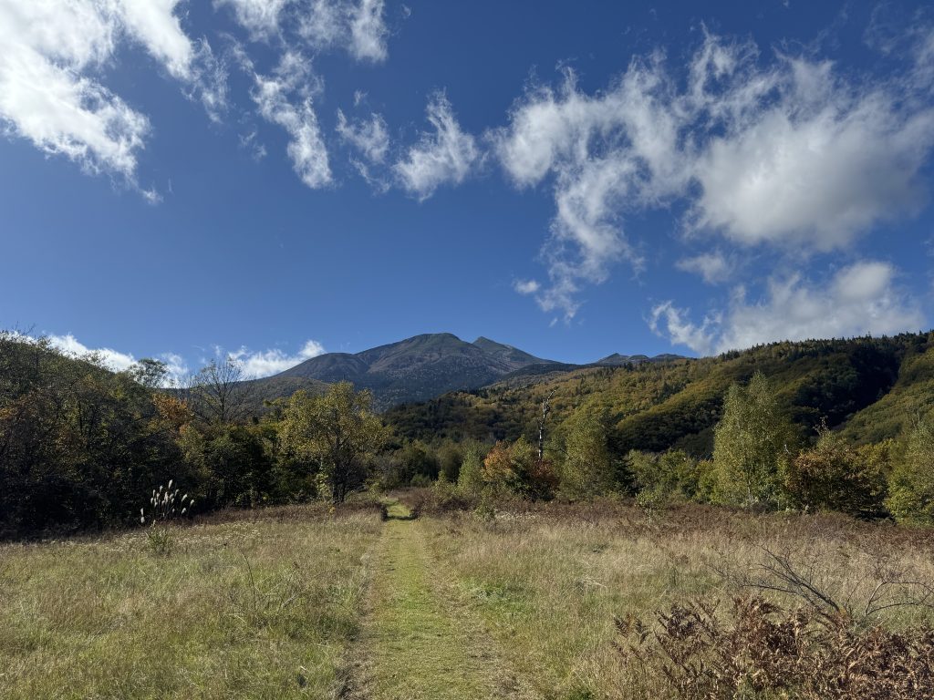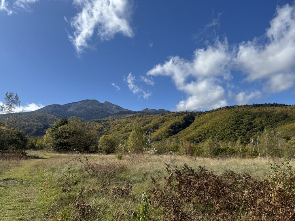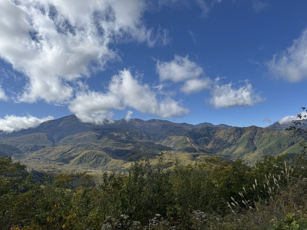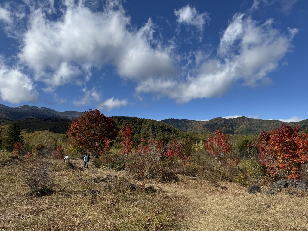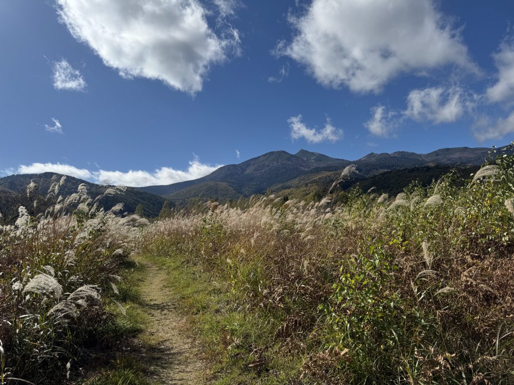 約90分のハイキングで、ススキが揺れる草原と、青空に映える紅葉の山々が圧巻でした。